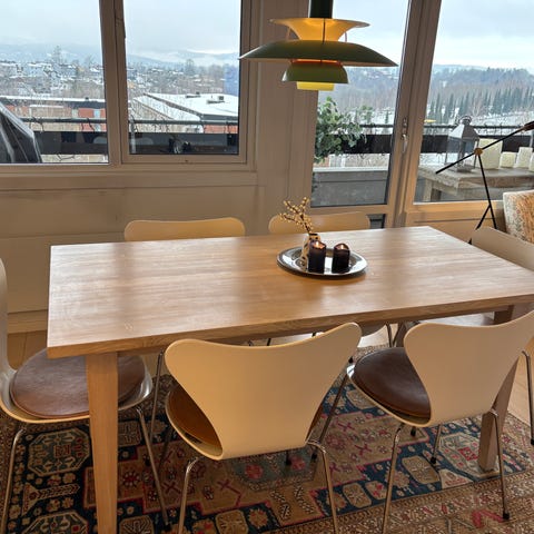 Viken spisebord fra 5 år gammelt. Natur eik 1 sortering derav lange hele staver. Noen små bruksmerker i bordplate men ettersom dette er heltre eik kan det lett pusses bort.