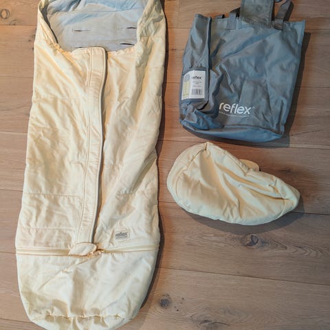 Varm vognpose/sovepose fra Reflex med dun. Med forlengerdel. God brukt - flekker på innsiden av hodedelen som ikke går bort i vask (fargeendring).