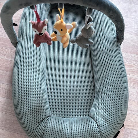 Voksi Baby Nest Premium babynest i hvit og beige. Babynestet er designet for å gi en trygg og komfortabel soveplass for babyer. Den har myke og polstrede kanter som omslutter barnet på en sikker måte. Følger med trekk. Renset.