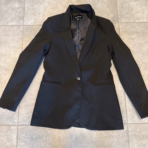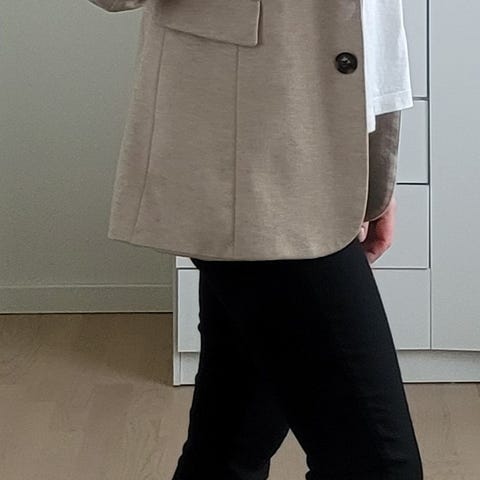 Selger en elegant og feminin blazer i sort med små hvite prikker fra Stradivarius. Klassisk snitt som sitter pent på kroppen. Passer både til hverdags og mer pyntede anledninger.