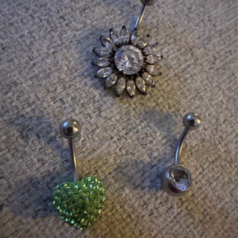 Alle er i kirurgisk stål. Til navle i forskjellige lengder. Til øyebryn og tunge?