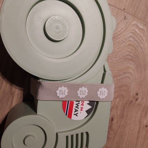 Grå matboks i plast fra Blafre. Formet som en traktor. Fin til matpakke i barnehagen eller på skolen. Inndeling med to rom oppi.