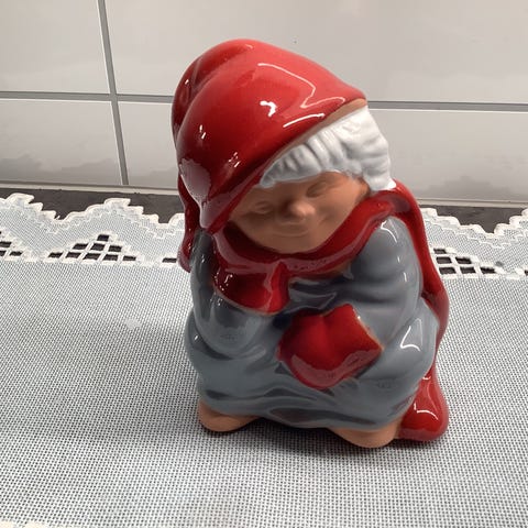 Inger Ekeberg figur av en kvinne iført blått og hvitt rutete forkle, med kringle i hendene. Figuren har detaljer som krøllete hår og ansiktstrekk malt på . Produktet er håndlaget og dekorativt.