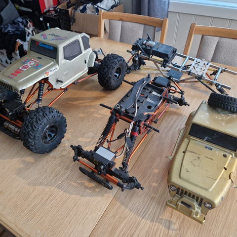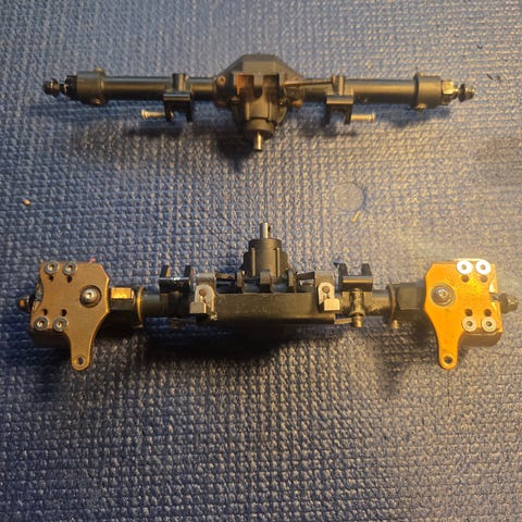 Er sett portalakseler fra Ali Express. Skala 1/10. Nypris rett over 1200 kr. Brukt en del og disse blir det fort merker i, noe som synes godt under. Gått over og limt med tokomponent epoxy, men alle bevegelige deler er fullt tilgjengelig.