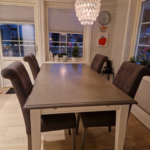 Utrekkbart spisebord med bordplate i lys farge og trestoler i naturfarget heltre. Bordet har mulighet for å utvides med integrert ileggsplate. God kvalitet og perfekt til en liten kjøkkenkrok, med plass til to, fire eller flere. Lampen fra Ikea er i akkurat samme farge, og følger med. Selges som komplett sett.