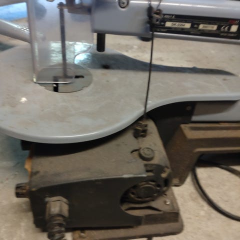 Gammel båndpusser i støpejern selges pga. plassmangel, alder ukjent. Maskinen har stått inne på varmt snekkerverksted i mange år, og har ikke vært i bruk. Det har manglet litt innfesting/bæring på høyre side, men stålstag medfølger til dette. Motoren går fint. Pussebånd medfølger ikke.