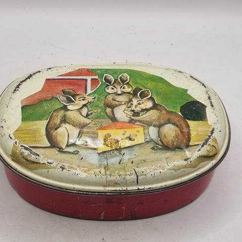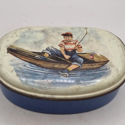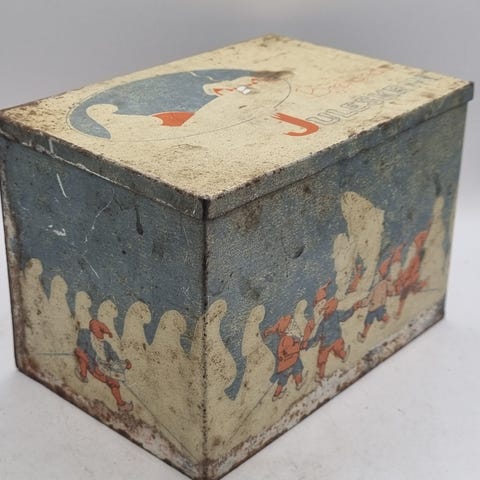 Boksen er i brukt vintage-tilstand med normale alders- og bruksspor, inkludert små riper, patina og lett slitasje på trykk og overflate. Lokk og form er intakte, og boksen egner seg til samling, utstilling eller dekor.