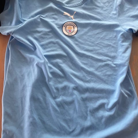 Manchester City Fotballtrøye med blå kamuflasjemønster. Trøyen har klubbens logo og sponsorlogo på forsiden. Egnet for fotballinteresserte og som supporterutstyr.