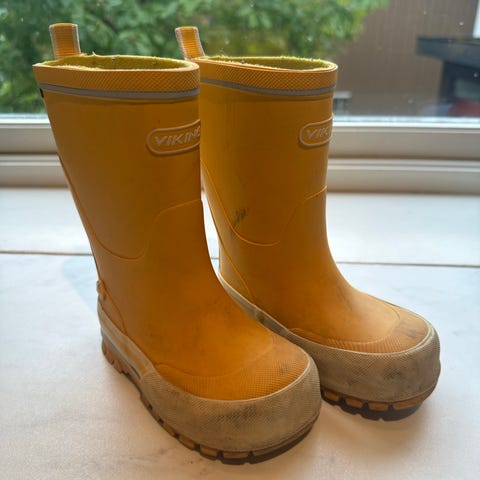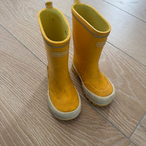 Viking barne gummistøvler i størrelse 26. kule gule. Brukt av ett barn en sesong med masse dårlig vær. Ytre merker etter regndress, men mye sko igjen.
