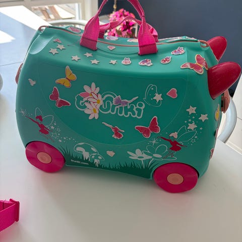Rosa trillekoffert til barn - kan sitte på