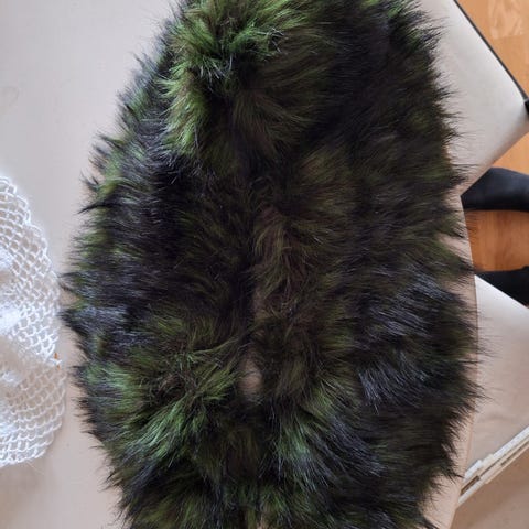 Fuskepels-krage i myk, pusete kvalitet med smale knytebånd. Ser flott ut både på en frakk, på en skjorte, strikkejakke eller genser. Aldri vært i bruk.