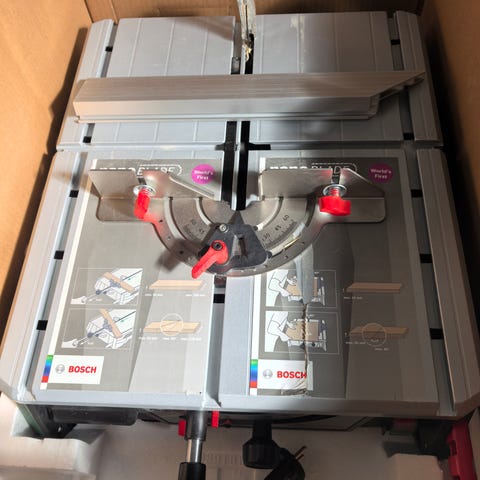 Bosch PTS 10 bordrundsag med integrert bord for stabil bruk. Sagblad og tilkoblingsmuligheter for støvavsug. Egnet for presisjonskutting av tre og andre materialer.