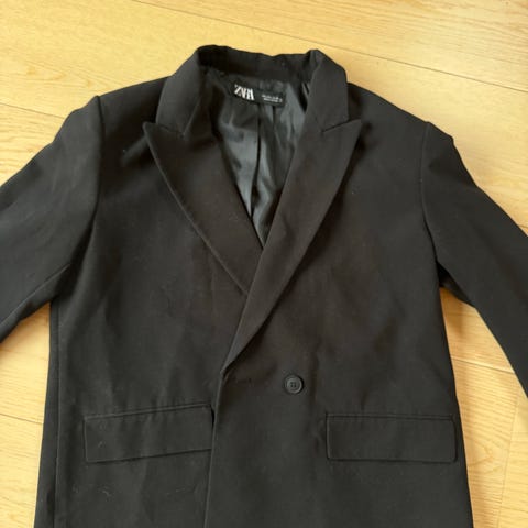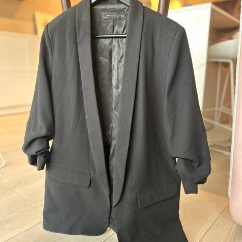 Zara blazer uforet, med 3/4 erme, i størrelse L. Laget av polyester materiale i svart farge. Jakken har dobbelspent knappelukking og et strukturert stoff lett stoff.