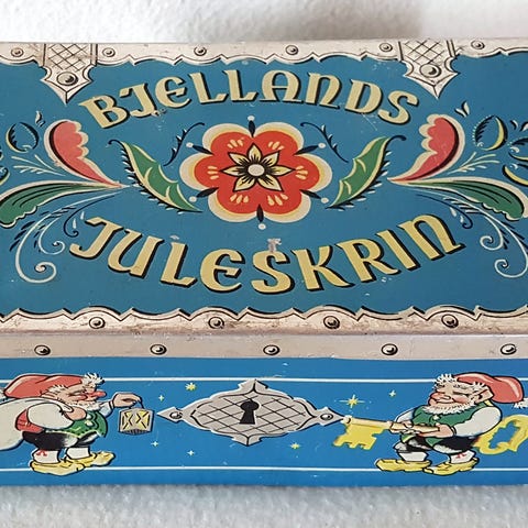 bjellands, juleskrin, vintage blikkboks, metallboks, Chr. Bjelland & Co, Stavanger, retro, julegave, nisser, 50-tallet, etterkrigstid, norsk design, samleobjekt, juledekorasjon, hermetikk
