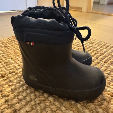Viking barne gummistøvler i størrelse 22, unisex modell. Støvlene er laget med slitesterkt materiale og har en foret innside for ekstra komfort og varme. Egnet for bruk i våte og kalde forhold. Pent brukt.