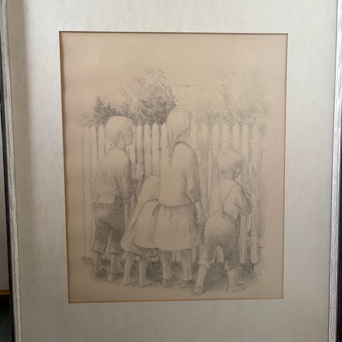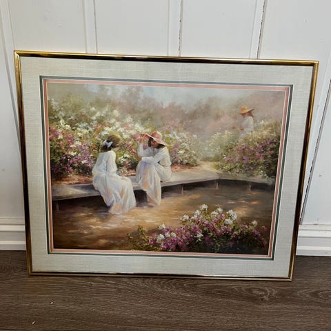 Ukjent kunstverk som viser et maleri med motiv av en blomsterhage. Bildet inneholder to personer, en voksen og et barn, som plukker blomster. Fargene i bildet er dempet og gir et nostalgisk preg.str.45*55 cm