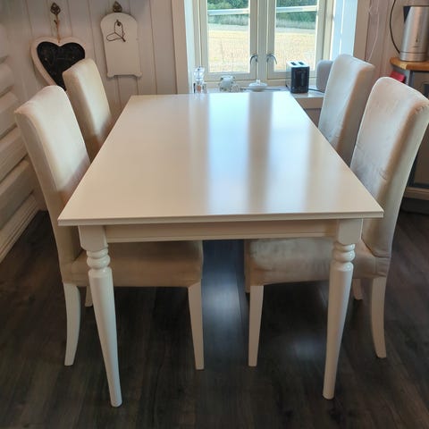 Greit IKEA bord av tre i hvit med 4 sorte stoler.
