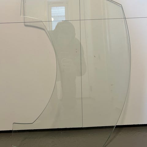 Halvrund underlagsplate i klart, herdet glass til bruk rundt ildstedet.