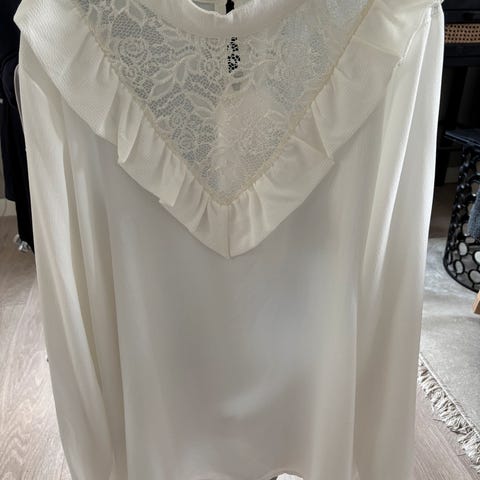 Svart bluse i et stretchy og noe shiny stoff. Den er dekorert med uthevede svarte, glitrende tråder. Den har høy hals med smock. Lange ermer med legg på skuldrene, en noe vid passform på ermene, og smalere mansjetter med smock og volangkant nederst. Blusen har mykt og stretchy fòr.