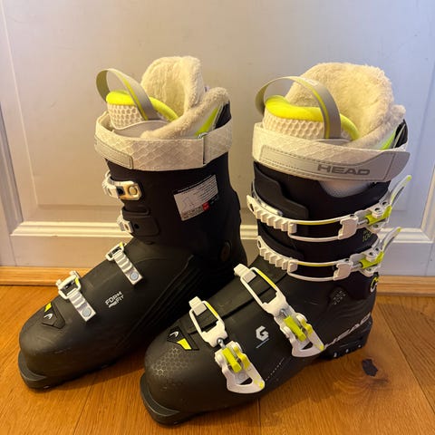 Head Formula RS 105 W GW Women skistøvler i størrelse 25,5. Fargen er mørk blå med gule detaljer. Skistøvlene er designet for kvinner og har en fleksibel passform tilpasset alpint bruk.