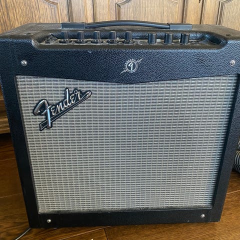 Fender Mustang LT25 gitarforsterker med flere kontrollknapper for lydjustering. Forsterkeren har et svart kabinett og er utstyrt med ulike innganger og utganger. Passer til bruk med elektrisk gitar.