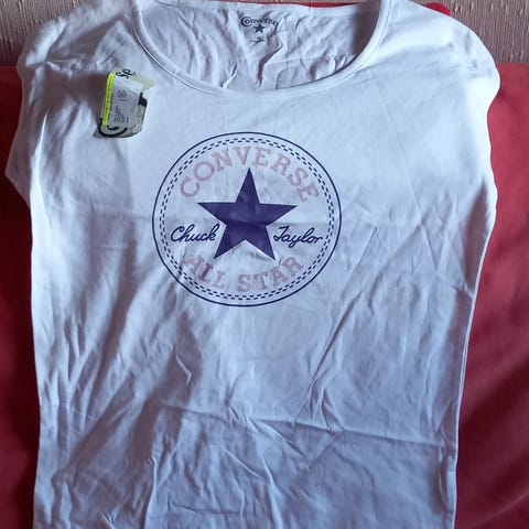 T-skjorte med bilde av converse sko, kul på med vid hals eller en offshoulder om ønskelig. Str. S. Ukjent merke. Mykt stoff.