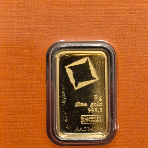Chafner gullbarre med en vekt på 5 gram og renhet på 999,9. Gullbaren er sertifisert av LBMA som en god leveringsraffinerer.PRISEN ER FAST.