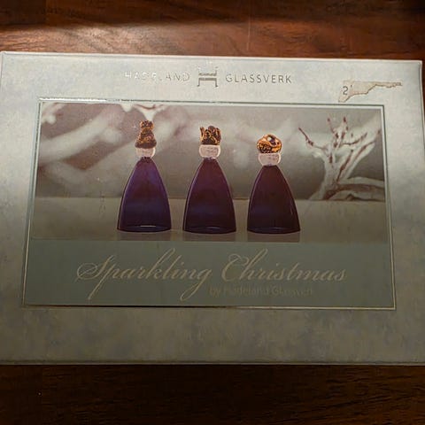 Disse er i kobolt blått glass med klare glasshoder og dekorative gullstafferinger på hodepryden.