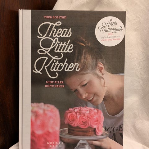 Thea Bolstad Theas Little Kitchen kokebok på norsk. Boken inneholder oppskrifter og matlagingsinstruksjoner med fokus på kaker og baking. Passer for personer som ønsker å lage kaker hjemme.