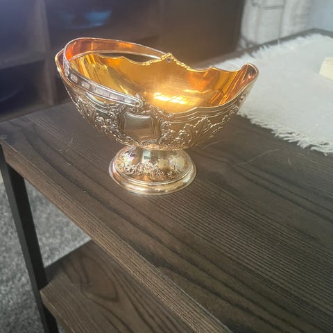 Pen bolle / skål trolig i sølvplett. Har stempel men klarer ikke å tyde det. Ser ut som japanske tegn. Derfor ikke enkelt å vite hva denne er laget av. Se bilder for mål. Var helt sort, men er blitt pusset blank.