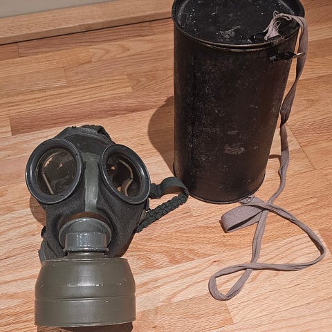 Tysk gassmaske fra andre verdenskrig med beholder selges kr 1400,- Eller beste bud.