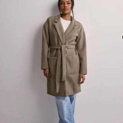 Pieces Kåpe i beige, størrelse XS (dame). Kåpen har belte i livet, to frontlommer og en klassisk krage.