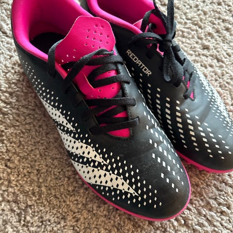 Adidas Predator fotballsko i svart og rosa farge. Skoene har snøring og er designet for bruk på fotballbanen.
