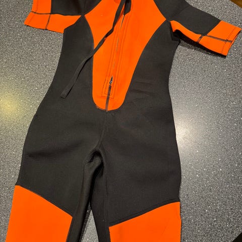Olaian Varm Vannsportdrakt for barn i størrelse 2-3 år (86-92 cm). Drakten er laget i neoprenmateriale og er designet for bruk i vann med temperaturer mellom 20°C og 25°C. Fargene på drakten er blå og rosa. Drakten har kort erme og kort ben, og har glidelås bak for enkel påkledning.