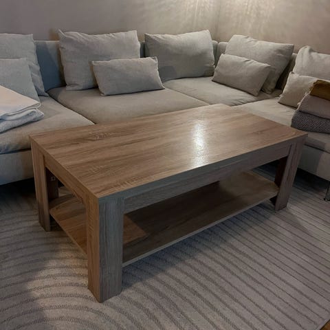 Hvit EIK sofabord med svarte stålbein med god oppbevarings plass. Bordet er likt på alle sider, få bruksmerker.