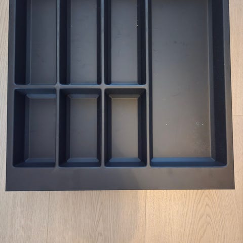 Bestikkinnsats til skuff i plastmateriale. Designet for organisering av bestikk med flere avdelinger.