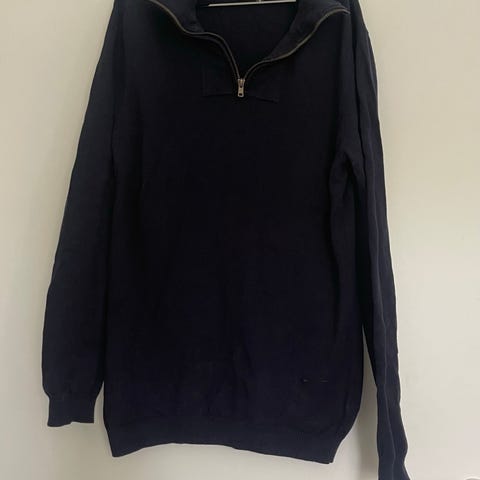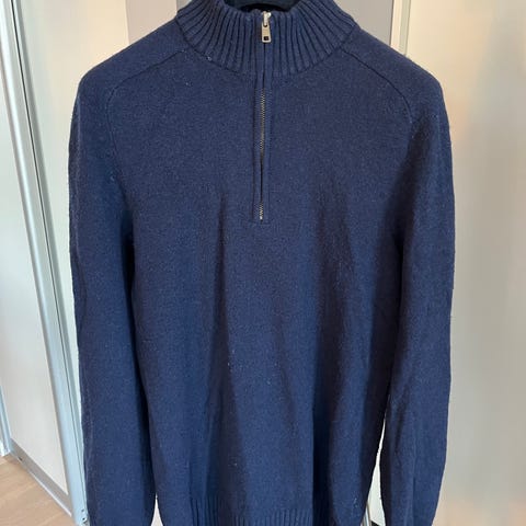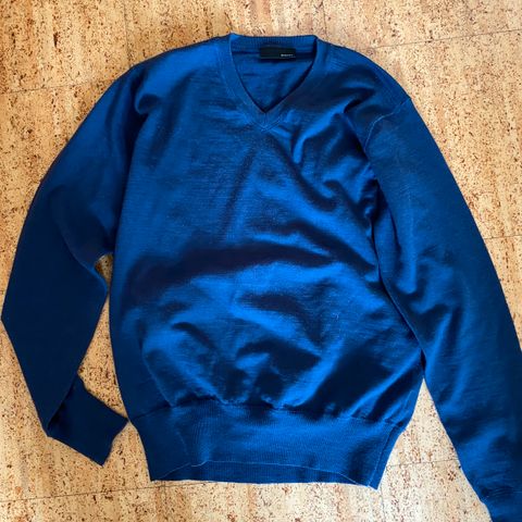 Helt ny genser fra Bertoini. Fin dyp blå farge, høy hals. I god og myk ull. Ny pris 1300,-
