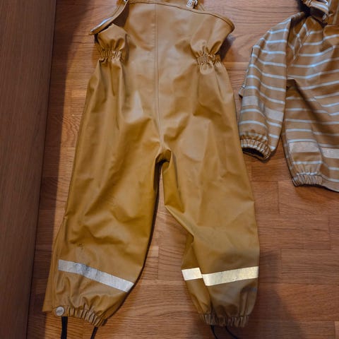 Regnjakke og bukse selges samlet. Noe misfarging etter bruk, men har ikke forsøkt å vaske det. Ene fotstrikken er delvis røket, ellers i fin stand.