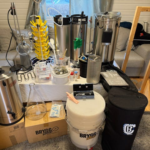 Med i salget følger også 5 Corneliusfat på 19L og 1 på 9L i tillegg til tre isolerande trekk til fata. Følger også med gassflaske og CO2- regulator