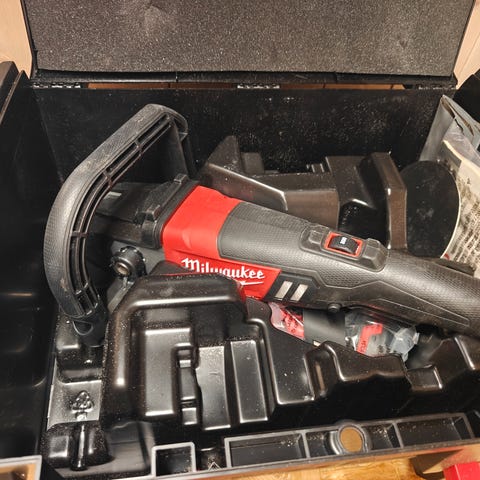 Milwaukee vinkelsliper med original og robust oppbevaringskoffert. Modellen er M18 CAG125XPDB-502X - selges uten lader og batteri.