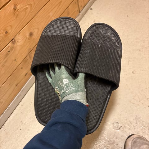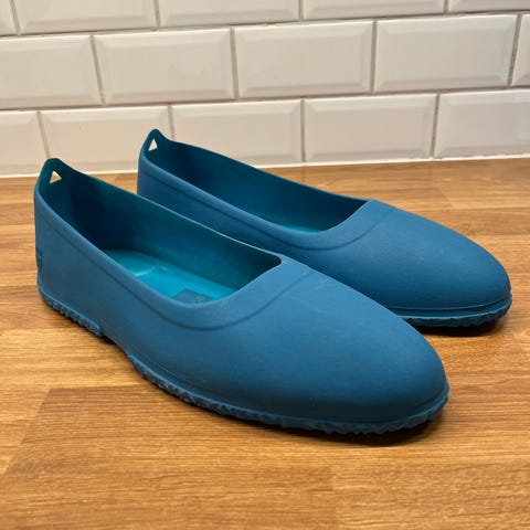 HappyFlops Slippers i størrelse 42- 43. Sklisikre såler med mønster for bedre grep. Åpen design med bred stropp over foten. Laget i slitesterkt materiale. Kun prøvd på, ikke brukt da det ble feil størrelse.