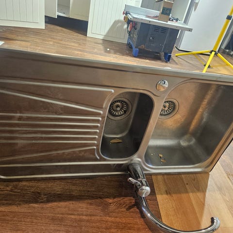 Dobbel vask med blandebatteri, stått montert i et kjøkken.