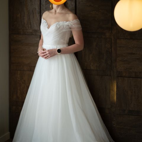 Overdelen er av et nydelig blonde stoff hvor blondene føres videre i armene på kjolen. Skjørtet består av flere lag med tyll i både hvit og beige som gir et nydelig spill både i inne- og utelys. Det ytterste laget med tyll har de samme blondene som overdelen.