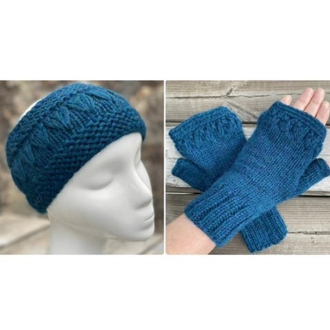 Sett med pannebånd /ørevarmer og pulsvanter /pulsvarmere, håndstrikket, nye