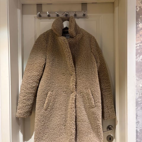 Noisy May kåpe i svart fuskepelsmateriale for dame, størrelse M. Kåpen har en myk og varm tekstur, egnet for kaldere vær. Den har en klassisk passform og lukkes med knapper foran.