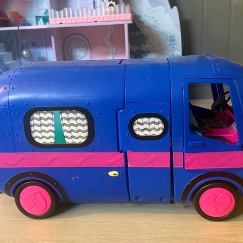 L.O.L. Surprise lekebil i blå og rosa farger. Bilen har åpne dører og ulike rom for lek. Egnet for barn som liker rollelek og samling av L.O.L. Surprise-figurer.