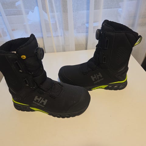 Helly Hansen vinterstøvler i størrelse 44, farge svart. Støvlene er designet for bruk i kalde værforhold og tilbyr isolasjon og beskyttelse mot kulde, innehar vernetupp. Skoene er å regne som ubrukt.
