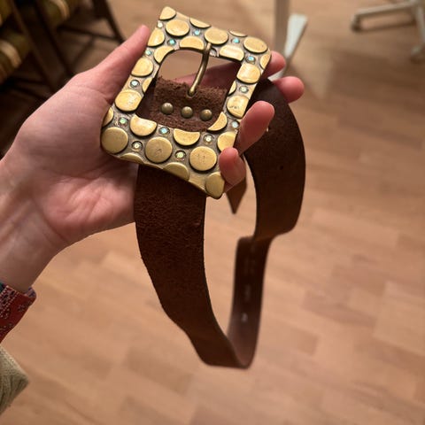 Hvitt belte med knapp detaljer, ca 1m langt. Ganske tungt.