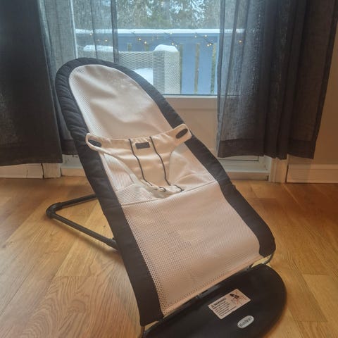 Selger denne strøkne vippestolen fra Babybjörn. Fra serien Balance Soft og i fargen sort med grå kjerne i et behagelig mesh-stoff.