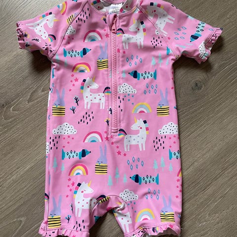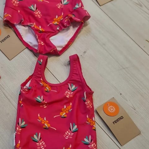Reima badedrakt og solhatt for jente i størrelse 86, farge rosa. Laget av materiale egnet for bading og solbeskyttelse. Badedrakten har glidelås foran for enkel påkledning. Solhatten har brem for ekstra solbeskyttelse.
